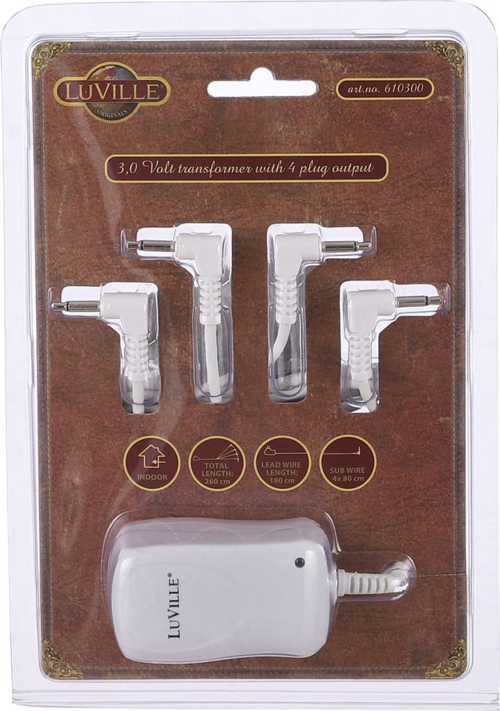 Benieuwd of de Luville General Switch adapter 3 volt with 4 plugs out in uw kerstdorp past? De afmetingen van het product zijn (L x B x H) 7x4x5 cm. Vul uw dorp kerstdorp nóg meer aan met andere Luville huisjes, figuren of andere accessoires.