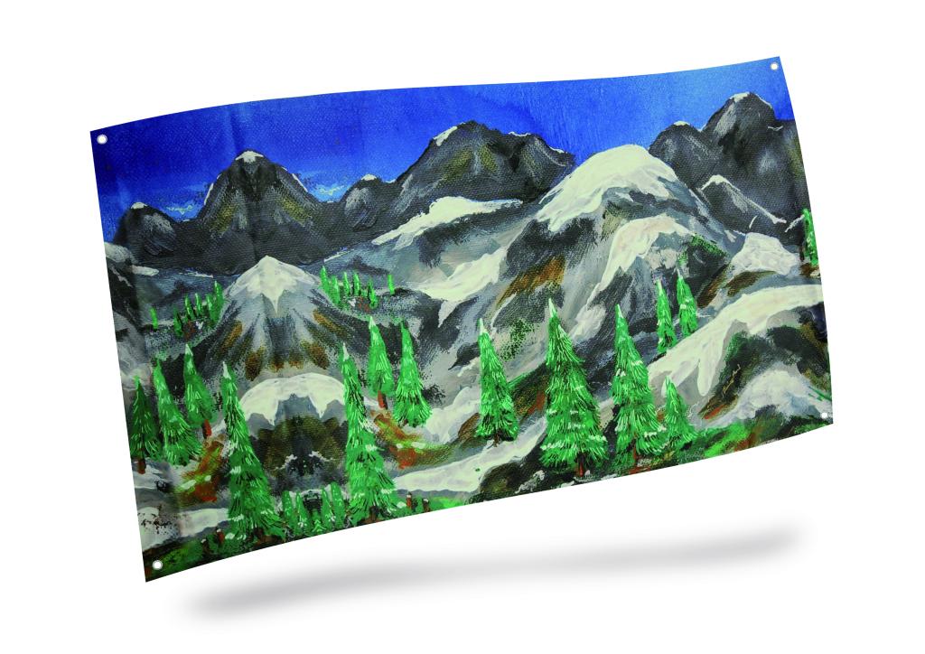 Dit achtergrond doek in geschilderde berglandschap stijl is zeer geschikt als decoratie voor uw winterlandschap of kerstdorp! Het is gemakkelijk te bevestigen aan de ringen in de hoeken en meet 150x75cm.