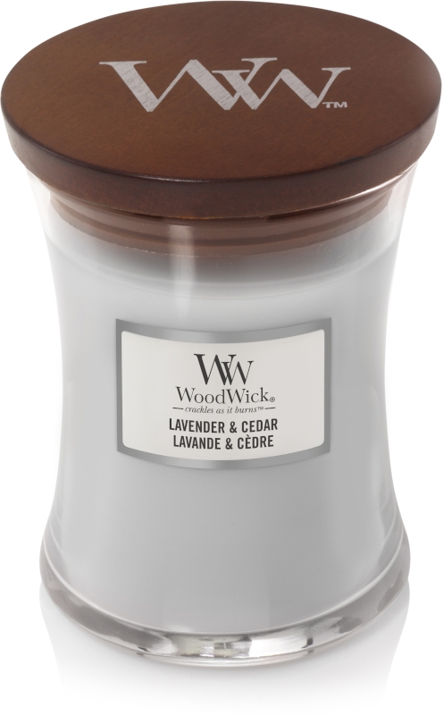 WoodWick geurkaars lavender & cedar medium candle is voorzien van een natuurlijk, houten lont waardoor het rustgevende geluid van een knisperend haardvuur een unieke sfeer creëert, terwijl jouw woonruimte gevuld wordt met een authentieke, natuurlijke geur.